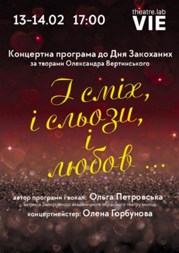 Концертная программа ко Дню влюбленных, по произведениям Александра Вертинского «И смех, и слезы, и любовь …». Автор программы и вокалист — актриса Запорожского академического областного театра молодежи Ольга Петровская, концертмейстер — Елена Горбунова.