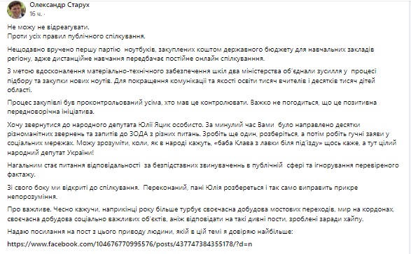 «Хочу обратиться к народному депутату Юлии Яцик лично. За прошедшее время Вами были направлены десятки разнообразных обращений и запросов в ЗОД по различным вопросам. Сделайте еще один, разберитесь, а затем делайте громкие заявления в социальных сетях. Могу понять, когда, как в народе говорят, «баба Клава со скамеечки у подъезда» что-то говорит, а тут целый народный депутат Украины! Насущным становится вопрос ответственности за безосновательные обвинения в публичной сфере и игнорирование проверенного фактажа.