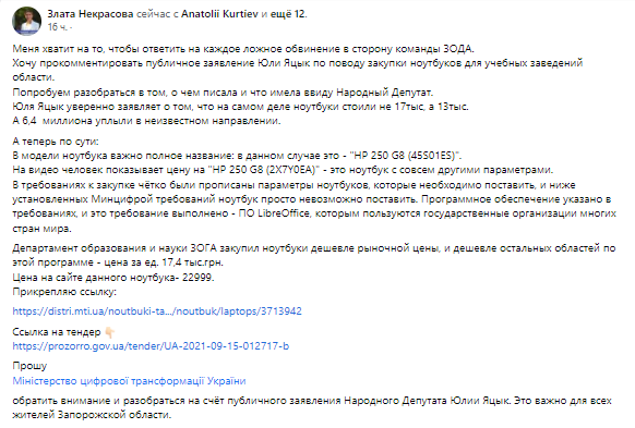 «Действительно, ну кто из учителей не рад такому прекрасному рабочему инструменту, как современный ноут?!! Одна незадача: стоимость завышена на 4 тыс. грн. на каждый, а всего – 6,4 млн. грн. из 40 млн. ушли в неизвестном направлении» — пишет Юлия Яцык, прикладывая к посту видео с обоснованием претензии.