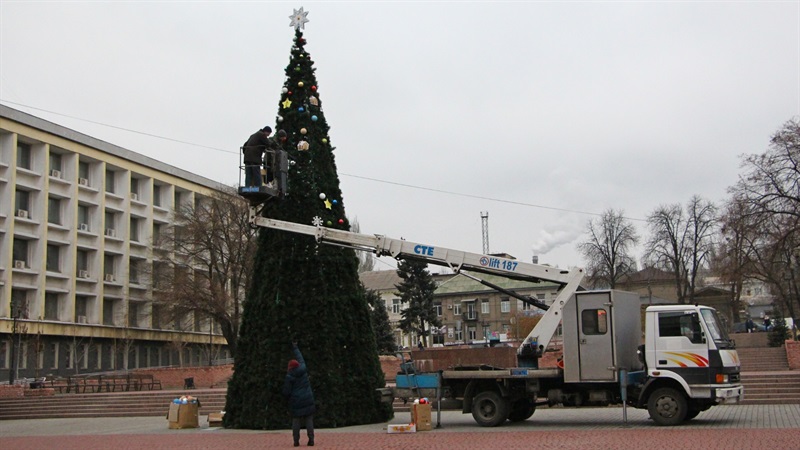 В Александровском районе Запорожья, в сквере Театральном, появилась еще одна новогодняя ёлка, высотой 12 метров.