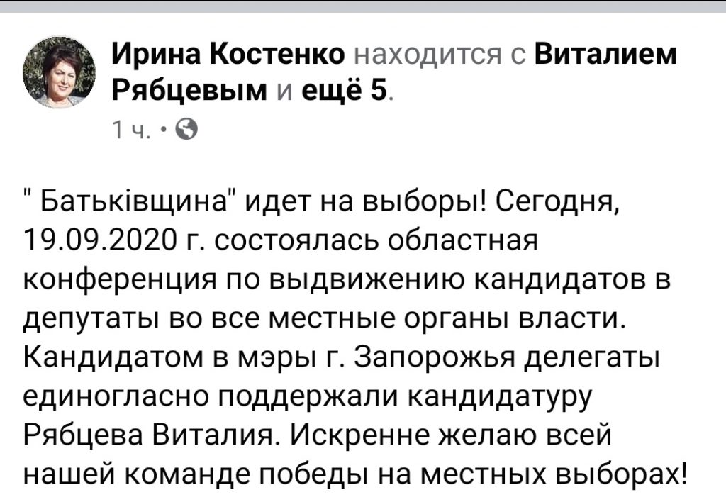 Об этом сообщила на своей странице в Фейсбук коллега Рябцева по партии и городскому совету Ирина Костенко. Решение о выдвижении кандидатов было принято на областной партийной конференции.