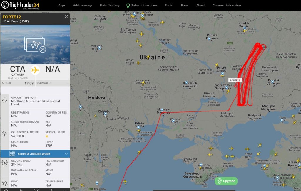Так, 19 мая, беспилотник ВВС США RQ-4 Global Hawk вылетел из базы ВВС США на острове Сицилия в Италии. БПЛА направился в восточную часть Украины, где с вечера барражирует над Запорожской, Днепропетровской, Харьковской и частично Донецкой областями Украины. Разведывательный беспилотник совершил более десяти облетов северной части Запорожской области. Полет БПЛА можно наблюдать в Flightradar 24.