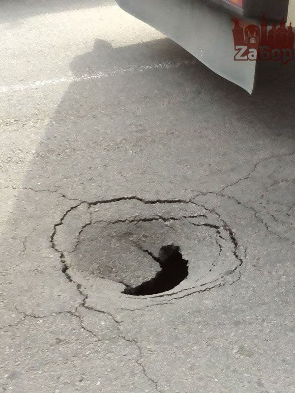 Здесь провалился асфальт, а на месте провала образовались трещины. По словам очевидцев, у водителей уже были проблемы на этом участке. При этом никаких ограждений и знаков здесь нет.