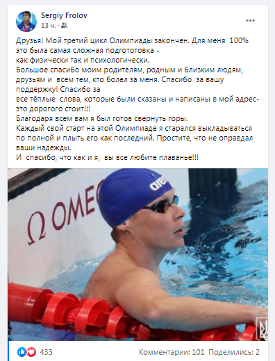 Трёхкратный участник Олимпийских игр, известный запорожский пловец Сергей Фролов на своих страницах в соцсетях опубликовал пост с благодарностью.