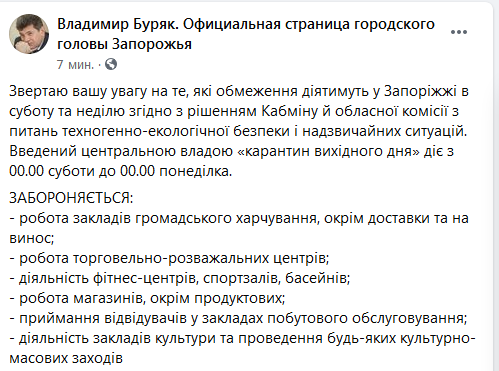 Сообщил об ограничениях, которые будут действовать на выходные в Запорожье и на следующей неделе городской голова Запорожья Владимир Буряк на свой странице в Фейсбук.