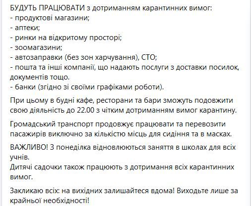 В тоже время стоит отметить, что в некоторых областных центрах (Черкассы, Тернополь, Ровно и др) городские власти отказались выполнять распоряжение Кабмина о карантине выходного дня, считая его абсурдным и таким, что серьезно повредит бизнесу и благосостоянию людей.