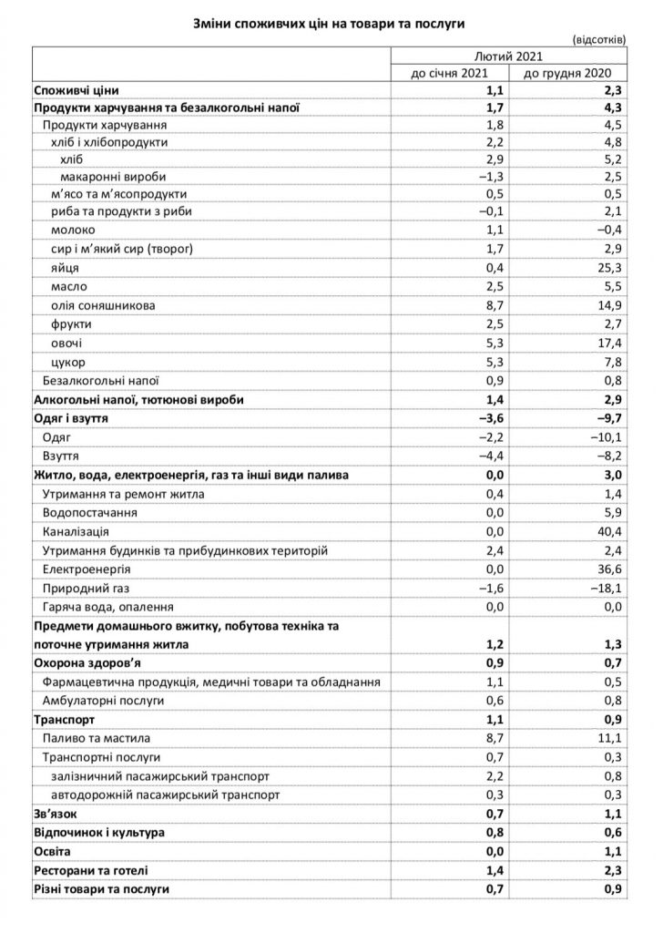 Цены на продукты питания и безалкогольные напитки в феврале 2021г. по отношению к январю 2021г. выросли на 1,7%. Больше всего подорожали масло подсолнечное, овощи и сахар (На 8,7-5,3%). Также выросли цены на хлеб, продукты переработки зерновых, фрукты, масло, маргарин, сыры, мясо птицы, молоко, говядину и телятину, сало (На 2,9-0,9%). В то же время, как утверждается, подешевели макаронные изделия (на 1,3%).