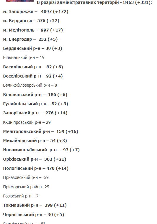 Больше всего новых случаев заражения выявлено в г. Запорожье (+172). Также заметный рост в Бердянске (+22), Мелитополе (+17), Мелитопольском районе (+16), Ореховском районе (+21), Токмацком (+11), Пологовском (+14), Запорожском (+14). Не фиксировались новые случаи заболевания всего в 6 районах области.