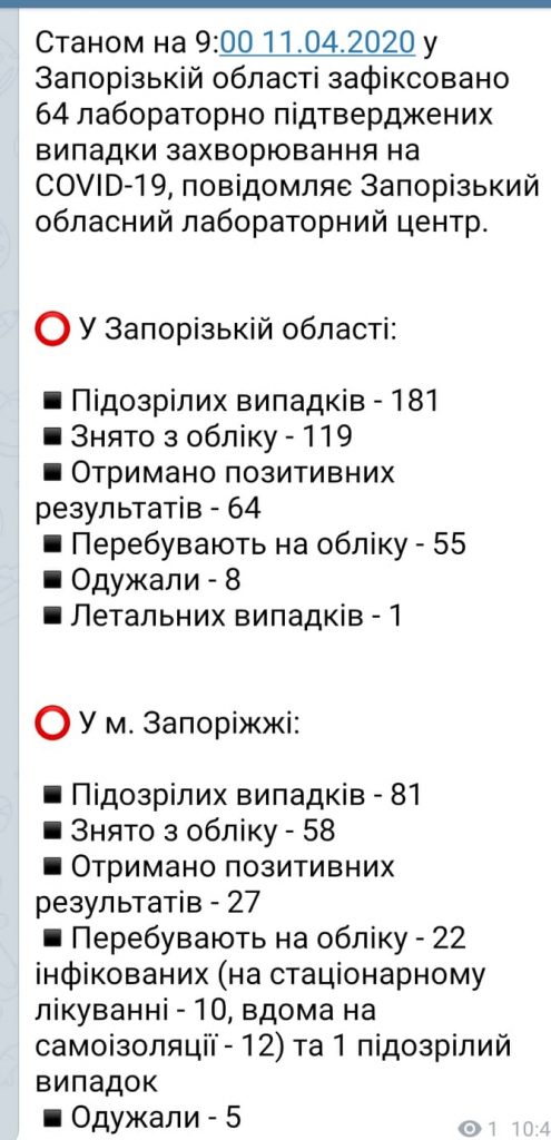 В Запорожской области за сутки согласно данных МОЗ количество зарегистрированных случаев достигло 64 . Это 10 на случаев больше, нежели 10 апреля. Вчера рост инфицирования был на уровне 7 случаев.