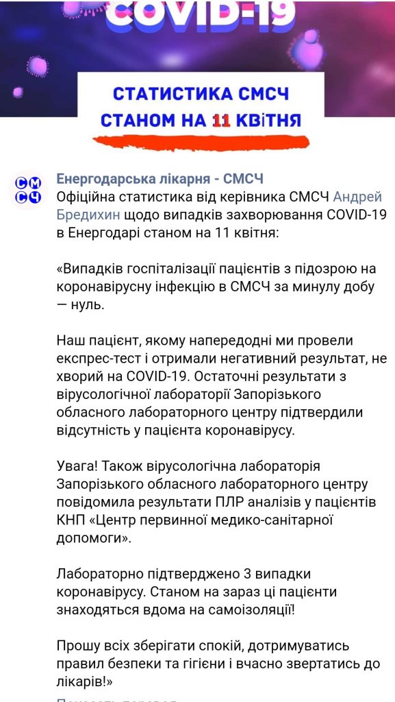 ОБНОВЛЕНО. Кроме того уже в течение 11 апреля стало известно о 3 случаях заражения коронавирусом в Энергодаре. Энергодар как и Ореховский район — новый очаг распространения в Запорожской области. На данный момент, как сообщается на странице КНП «Специальная медико-санитарная часть» Энергодарского городского совета, состояние пациентов не тяжёлое, они пребывают дома на самоизоляции.