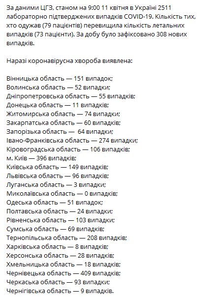 Согласно информации на 9:30 11 апреля в Украине зарегистрировано 2511 случаев COVID-19, из которых 73 смертельных, 79 пациентов выздоровело.