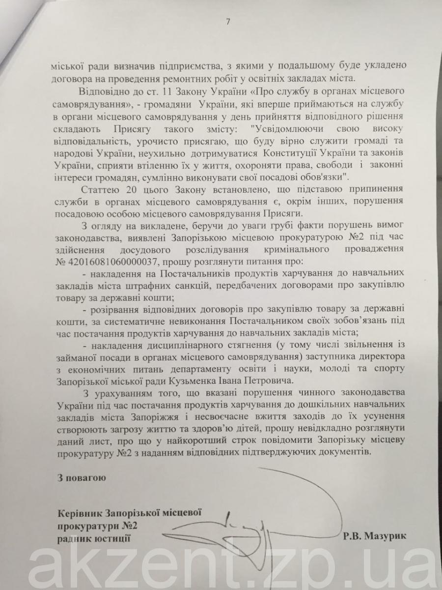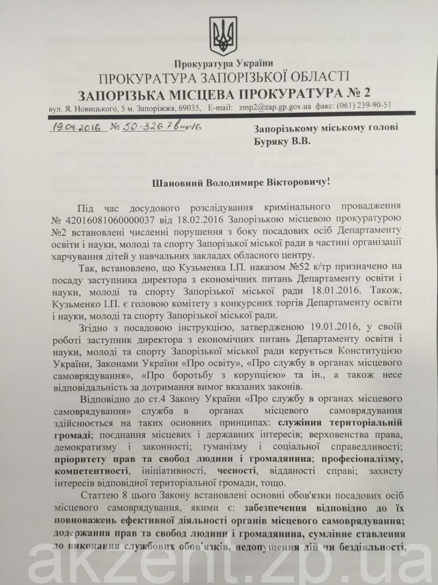 19 апреля запорожская прокуратура № 2 обратилась к городскому голове Запорожья Владимиру Буряку с просьбой предпринять меры по факту организацией заместителем Департамента образования некачественного питания в дошкольных учебных заведениях города.