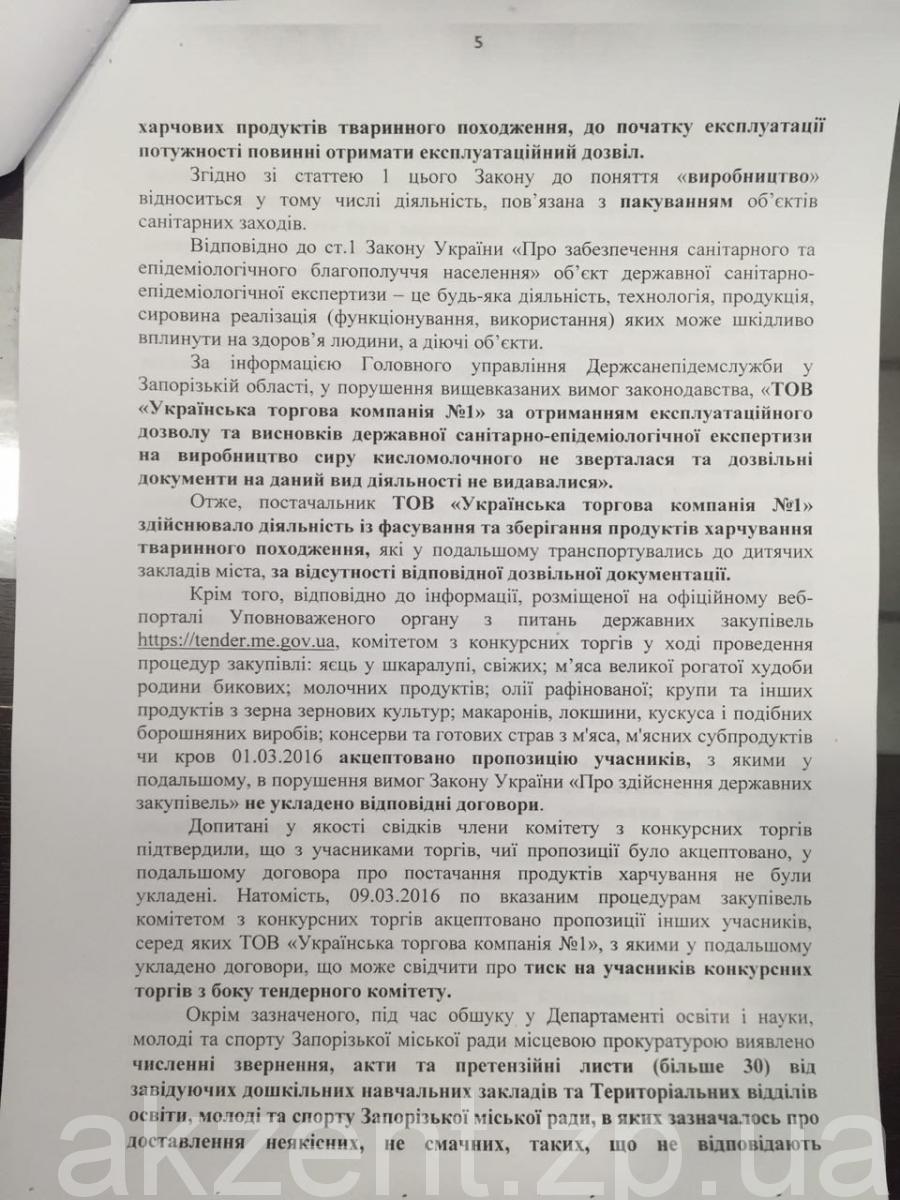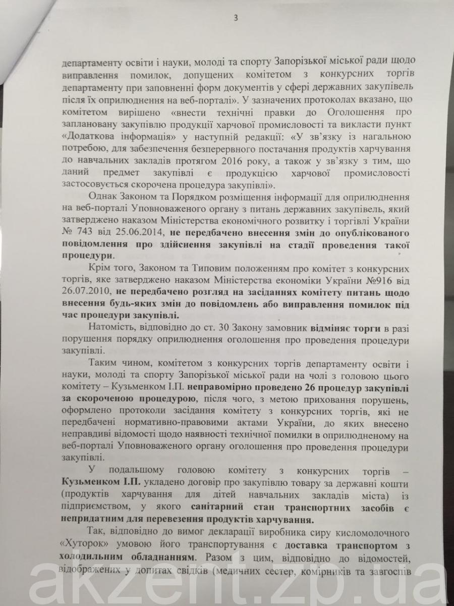 «Согласно ст. 30 Закона заказчик отменяет торги при нарушении порядка оглашения о проведении процедуры закупки. Таким образом, комитетом по конкурсным торгам департамента образования и науки, молодежи и спорта Запорожского городского совета во главе с Кузьменком И. П. неправомерно проведено 26 процедур закупки по сокращенной процедуре», — отмечается в обращении к Буряку.