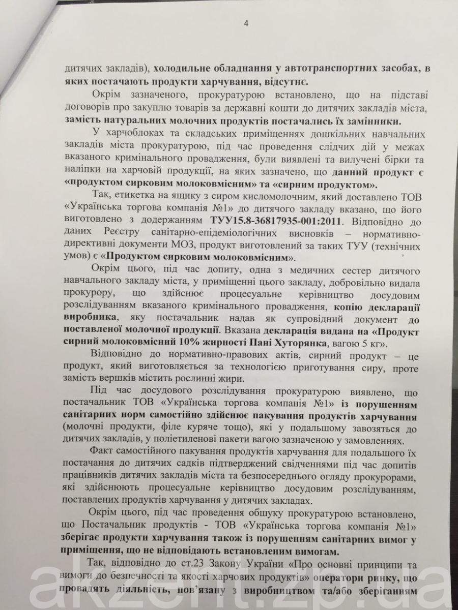 Также прокуратура установила, что вместо натурального молока детям поставляли его заменители. А поставщик ООО «Украинская торговая компания № 1» без соблюдения санитарных норм самостоятельно запаковывала продукты. Также не соответствовали требованиям и условия хранения молочных продуктов, мяса и т.д. Кроме того, у данной компании отсутствовало разрешение от санэпидем службы на изготовления кисломолочных продуктов.