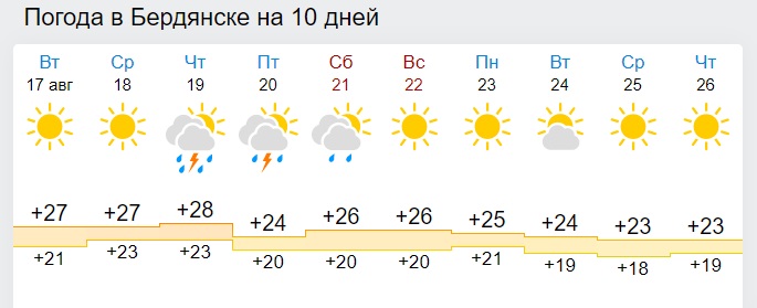 Бердянск также будет располагать к отдыху. 21 августа вероятный небольшой дождь. Температура воздуха будет колебаться от +24 до +26 градусов. Ожидается солнечная погода с переменчивой облачностью.