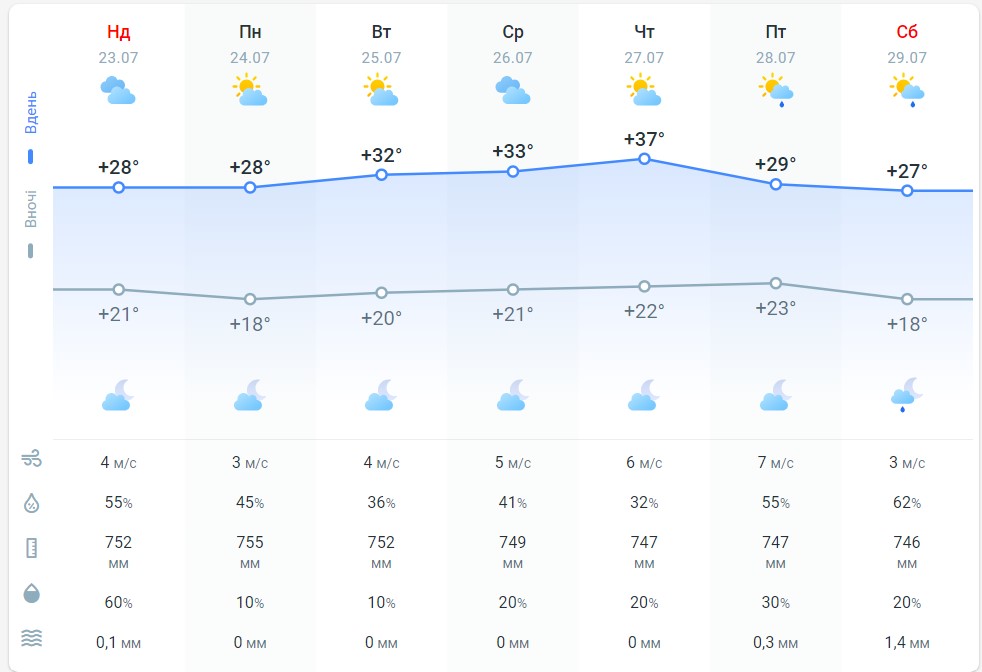 Завтра, 24 липня, чисте небо у другій половині дня зникне за хмарами, але ввечері погода знову проясниться. Разом з цим температура повітря буде вищою за неділю — до +27 градусів Цельсія.