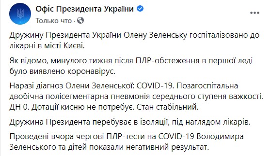 Сейчас диагноз Елены Зеленской: COVID-19. Внегоспитальная двусторонняя полисегментарная пневмония средней степени тяжести. ДН 0. В дотации кислорода не нуждается. Состояние стабильное.