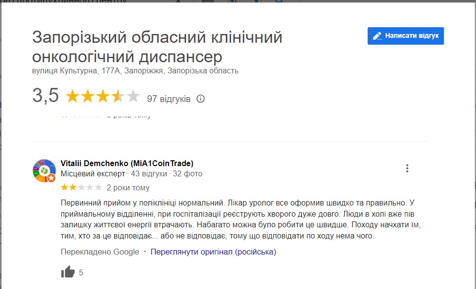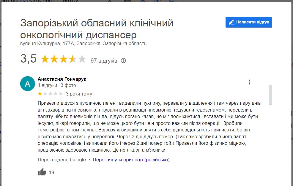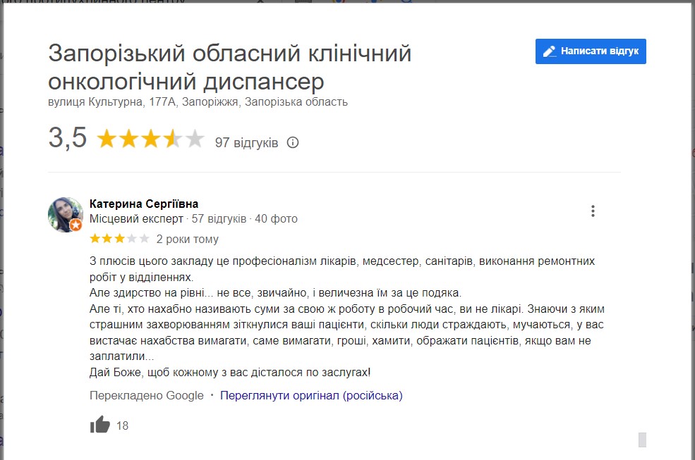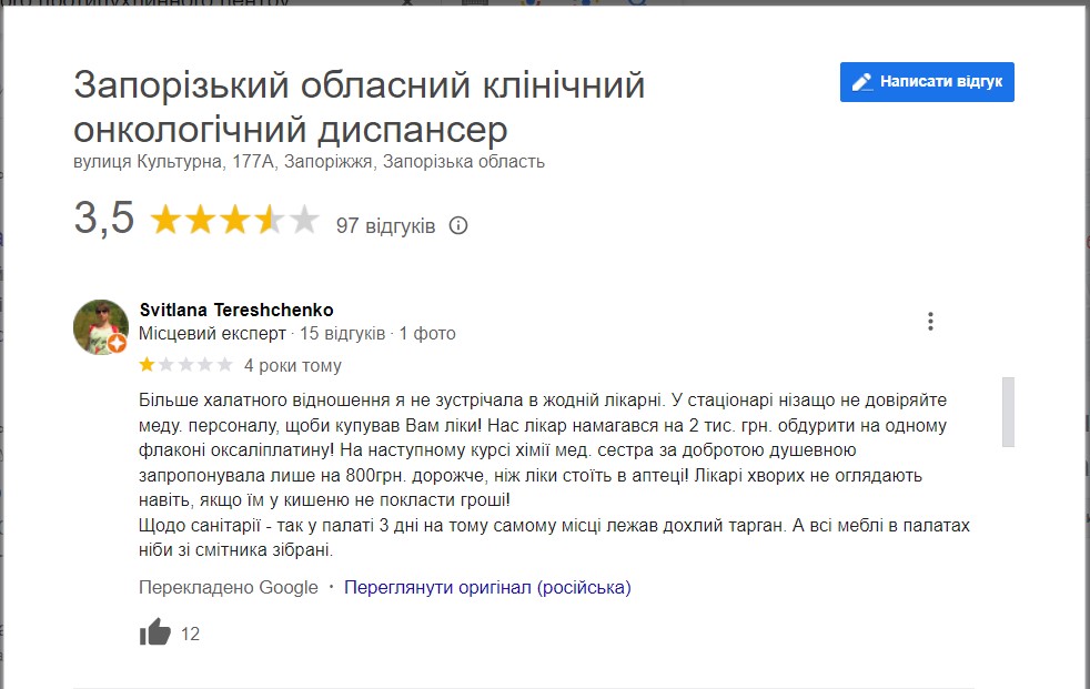 Як ми зазначали вище, з десятків тисяч заявлених пацієнтів ЗРПЦ, лише одиниці вирішили приєднатися до “відкритої зустрічі” та стати на захист керівників протипухлинного центру. На противагу публічним звітам адміністрації, відгуки пацієнтів про реальний стан справ в медзакладі в останні роки далекі від похвальних.