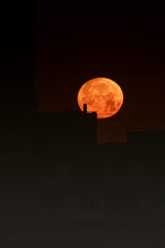 «Суперлуна. Поймал как уже скрывался за домами, супермесячное астрономическое явление. Полнолуние совпало с моментом наибольшего сближения Луны и Земли, спутник стал казаться на 14% больше и на 30% ярче обычного» — подписал автор.