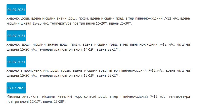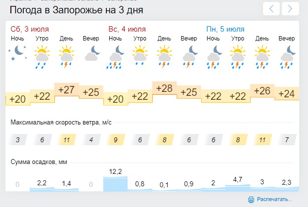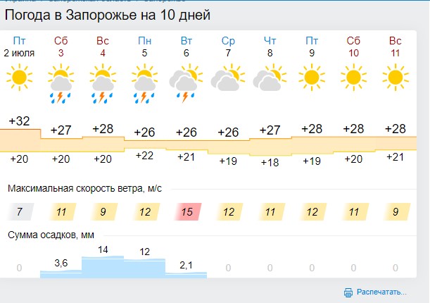 Согласно данным Запорожского областного гидрометцентра, в ближайшие выходные, 3-4 июля, на территории области ожидаются сильные дожди с грозами, град, шквальные порывы ветра до 15-20 м/с. Температура воздуха в дневные часы несколько снизится — до +22..+27 градусов.