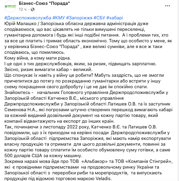 Інформацію підтверджують представники таких компаній як “Альбакор” та “Компанія Стінгрей” (“Veladis”) вже підготували лист-звернення до Андрія Єрмака з ОП, бізнес-омбудсмена Романа Ващука, очільника Запорізької області Юрія Малашко, та до Голови НАБУ. Повний текст можна знайти на офіційному сайті запорізького бізнес-союзу “Порада”.