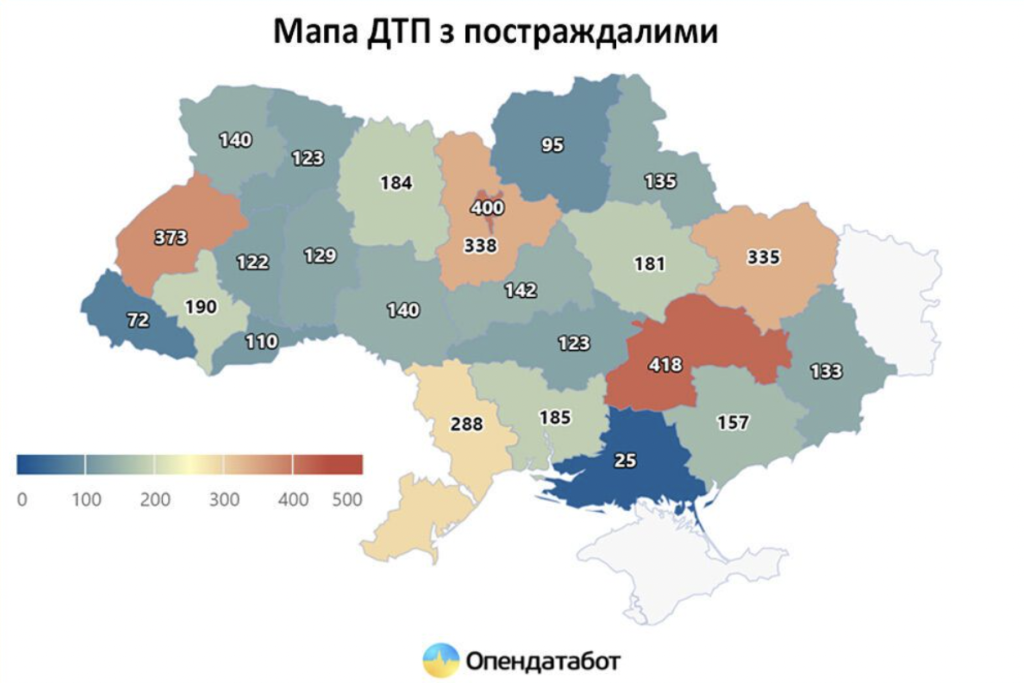 Лідером антирейтингу є Дніпропетровська область, де зареєстровано найбільшу кількість ДТП з жертвами.