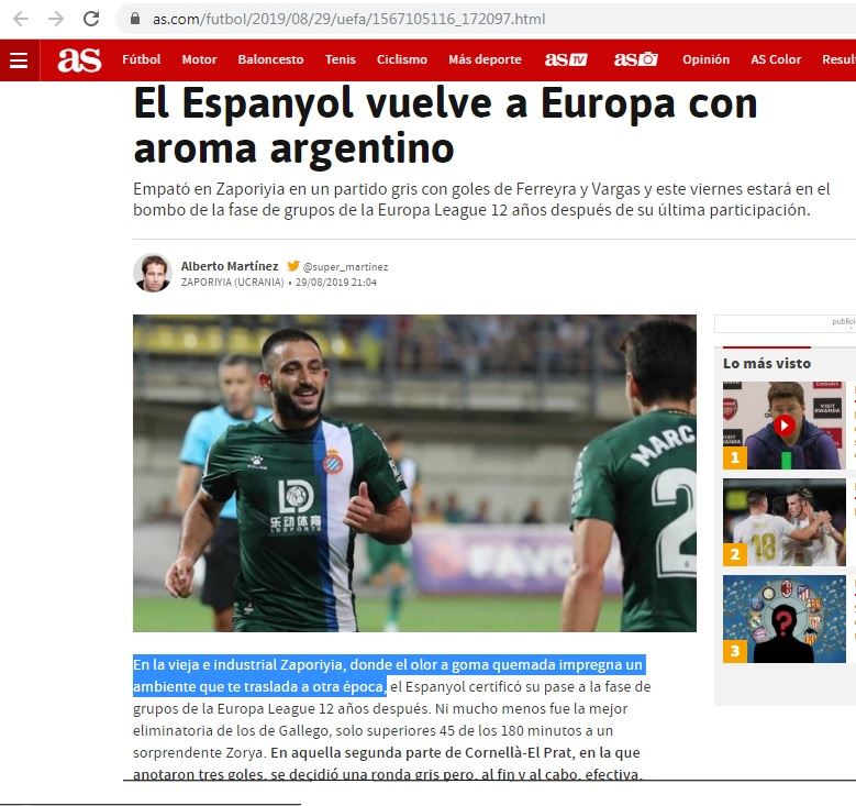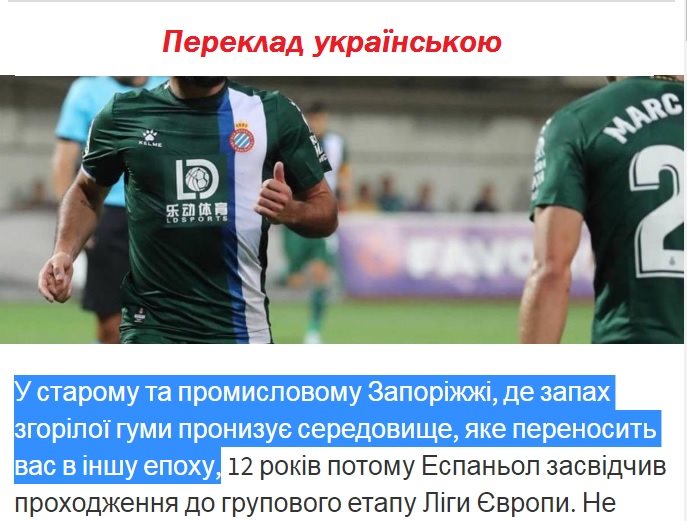 Стояновский привел скрины из популярной в Испании спортивной он-лайн газеты AS, в которой репортер посетивший матч «Заря»-«Эспаньол», в первых же строчках дал грустную оценку Запорожью, назвав его «старым, промышленным городом, где запах сгоревшей резины пронизывает окружающую среду, перенося вас в другую эпоху»…