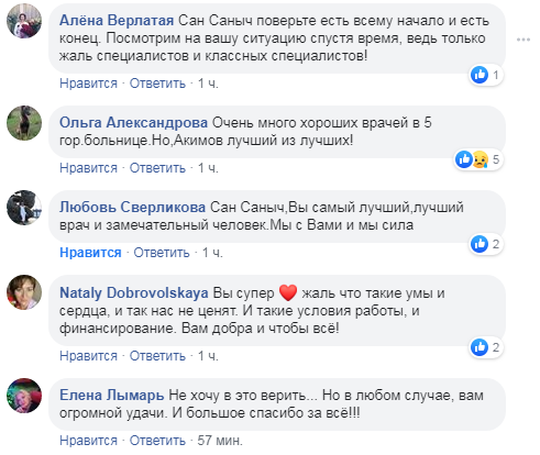 Многие пользователи негативно восприняли уход Акимова с должности заведующего, оценивая его как высококлассного специалиста, с увольнением которого больница потеряет в качестве предоставления медицинской помощи.