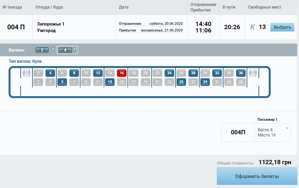 Отметим, что на данный момент Укрзализныця продает только билеты вагонов купе. Их стоимость на поезд Запорожье — Ужгород на 20 июня составляет 1122 гривны.