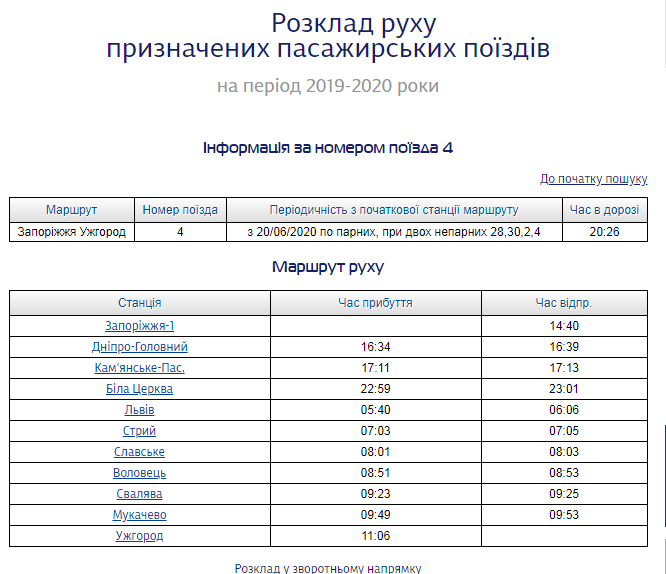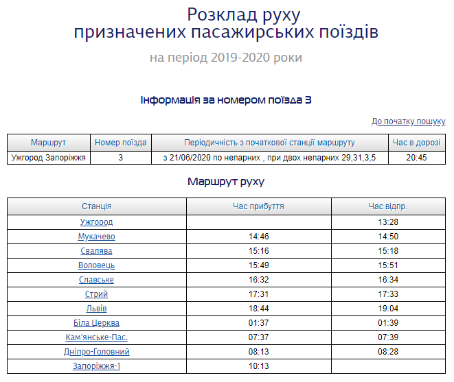 Поезд №4 / 3 Запорожье — Ужгород из Запорожья осуществит рейс 20 июня, обратно из Ужгорода — 21 июня. С маршрутом движения вы можете ознакомиться ниже. Поезд будет проходить в частности через Мукачево, Львов, Белую Церковь, Каменское и Днепр.
