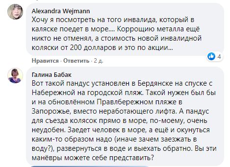 Отметим, на некоторые претензии сразу ответил один из инициаторов установки пандуса, сообщив, что он мобильный и разборной, осенью его уберут из воды и штормы и коррозия ему не так страшны.
