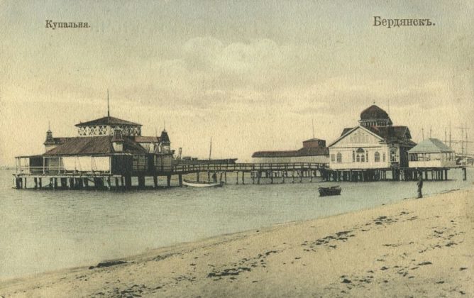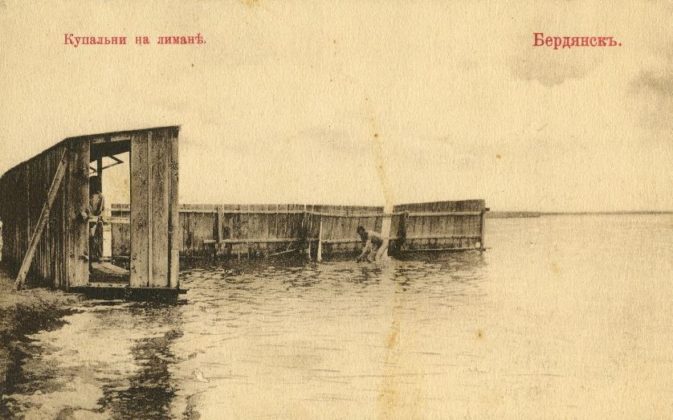 На этих фото изображены так называемые “купальни Калтикьяна”. О популярности бердянских пляжей свидетельствует запись в путеводителе «Крым», изданном в 1914 году: «Купанье в Бердянске хорошее. Лучшее время – август, сентябрь. Жизнь сравнительно недорога…».