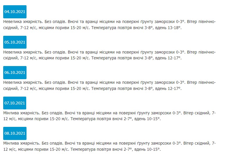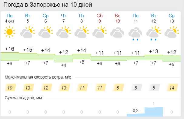 Согласно данным Запорожского областного гидрометцентра, ближайшие несколько дней выдадутся ветренными. Ночью возможны заморозки на поверхности грунта. Температура днем +2…+8 градусов, днем 4-6 октября +12…+17 градусов, 7-8 октября немного похолодает до +10…+15 градусов.
