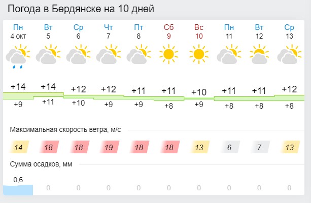 Что касается других городов области, то немного выше температура воздуха ожидаеся в Мелитополе и Энергодаре, наиболее ветренно — в Бердянске. В целом температурный режим будет схожим — днем стоблики термометров будут колебаться от +10 до +15 градусов. Осадков не ожидается.