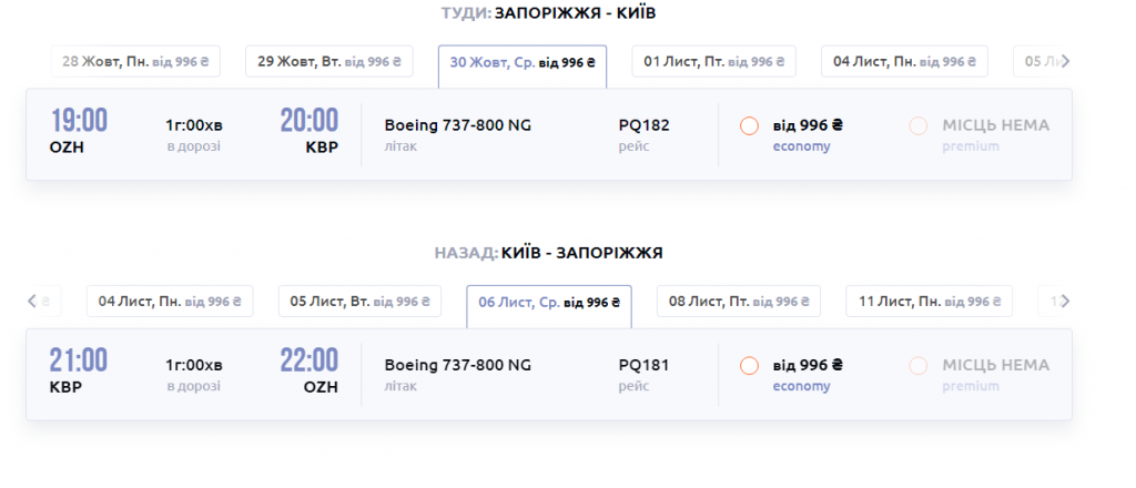 Из Запорожья вылет в 19:00, прибытие в Киев в 20:00. Обратный рейс в 21:00, прибытие в Запорожье в 22:00. По понедельникам вылет из Запорожья в 7:00.