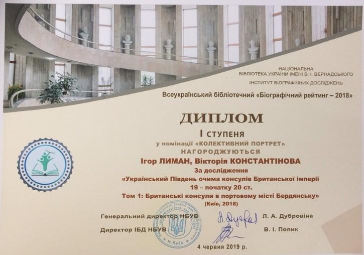 Труд под названием «Британские консулы в портовом городе Бердянске» признана лучшей в номинации «Коллективный портрет», а вторая книга ученых «Немецкие консулы в Северном Приазовье» вошла в десятку этого рейтинга.