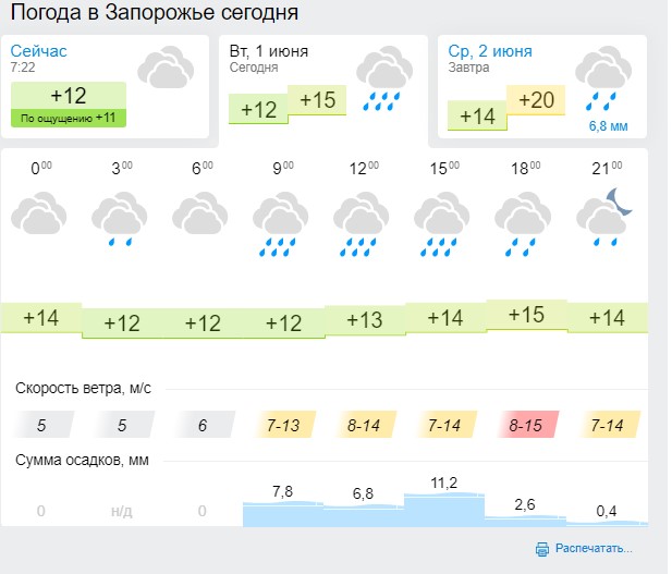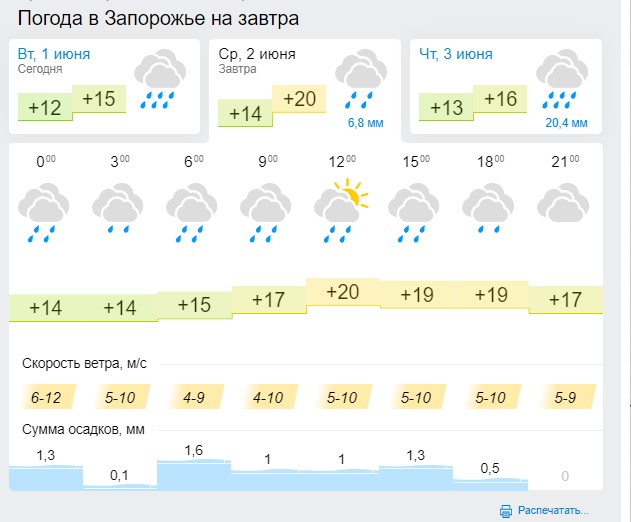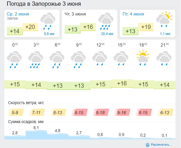 Согласно данных сервиса Gismeteo дождь значительной интенсивности будет идти в Запорожье весь день, однако после 18:00 он станет заметно слабее. Затвра же, 2 июня в течение дня осадки будут уже значительно меньше. Вновь сильные дожди ожидаются в ночь со среды на четверг, а в течение дня 3 июня осадки постепенно прекратятся.