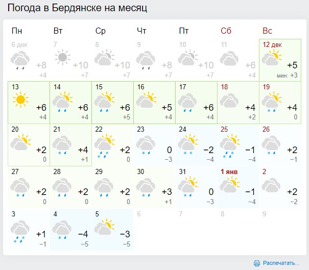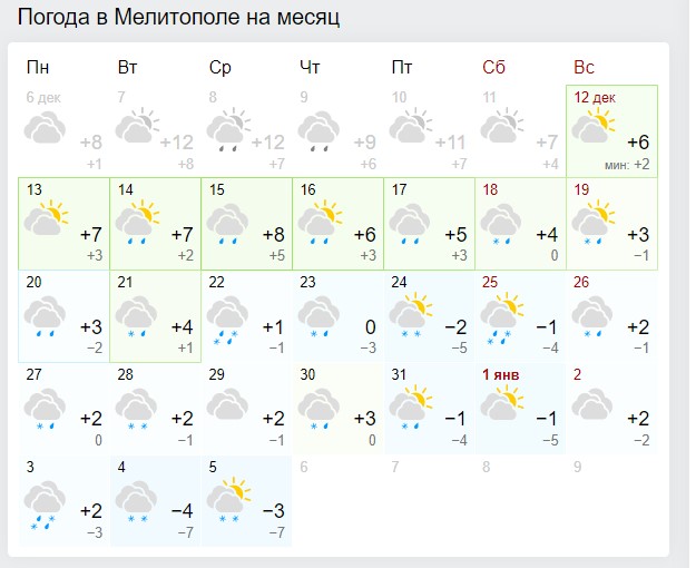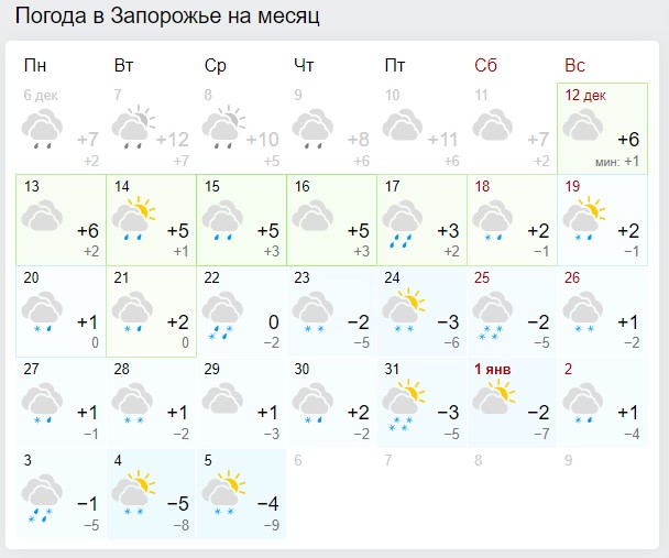 Погода в декабре в Мелитополе, Бердянске и Энергодаре