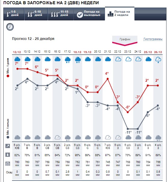 Схожий прогноз погоды на бдижайшие две недели по Запорожье дают и на сервисе Meteoprog, с той лишь разницей, что здесь 22-23 декабря дают более сильные морозы — до -11 градусов ночью и до -6 градусов днем.