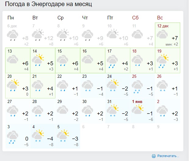 Более заметно похолодание ожидается в конце первого меясца зимы. Начиная с 22-23 декабря столбики термометров стабильно в течение суток будут опускаться ниже ноля градусов, ожидается и небольшой снег. Температура воздуха ночью опустится до -3…-6 градусов. Со снегом и небольшими морозами прогнозируется пока что и новогодняя ночь, а также первые числа января.