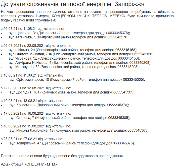 «На время проведения плановых остановок котельных на ремонт и проведение испытаний на плотность тепловых установок и сетей, концерн «Городские тепловые сети» будет временно прекращена подача горячей воды потребителям», — пишут в сообщении.