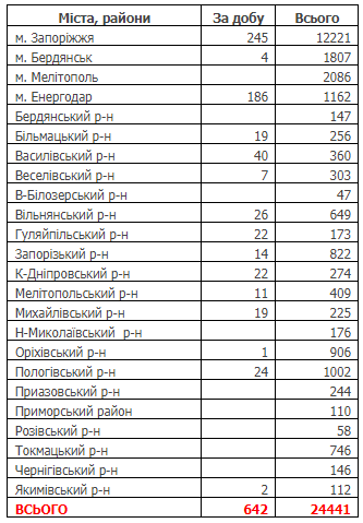 За последние сутки обследовано 805 человек, в т.ч. 720 — на базе ГУ «Запорожский ОЛЦ МЗ Украины», выявлено 642 инфицированных.