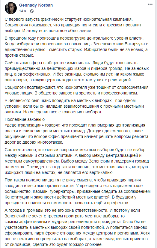 Бизнесмен и соратник мэра Днепра Бориса Филатова Геннадий Корбан на свое странице Фейсбук спрогнозировал провал правященй партии на осенних выборах в местные органы власти и дал этому объяснение. По его мнению Зеленскому и его политсиле из-за последних действий президента и его команды стоит вообще не принимать участие в местных выборах, а лучше