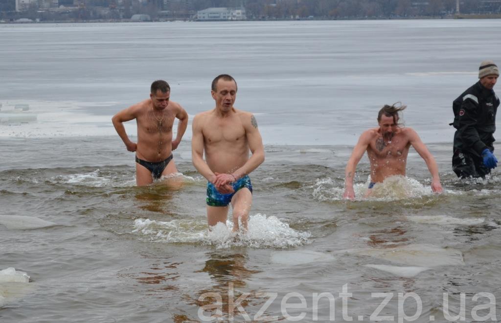 На пляже дежурили спасатели и медики. Бойцы ГСЧС в воде отгоняли от берега льдины, чтобы те не мешали запорожцам с разбегу нырять в Днепр.