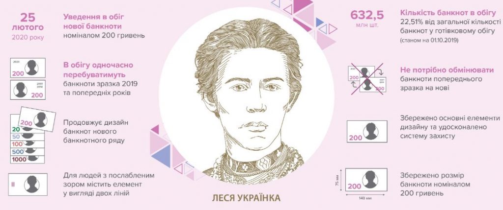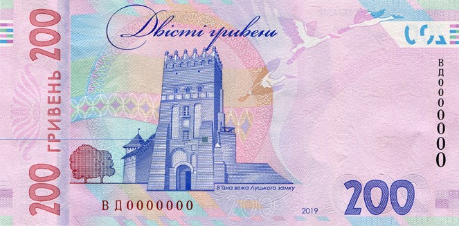 “На банкноте нового образца номиналом 200 гривен сохранены основные изображения банкноты образца 2007 года. В частности, на лицевой стороне размещен портрет Леси Украинки, а на оборотной стороне — изображение здания въездных башни Луцкого замка. Портрет Леси Украинки перемещен в центр банкноты (ранее был с правой стороны). Размер новой банкноты не изменился — 75 x 148 мм. Цветовая гамма та же”, — отметили в НБУ.