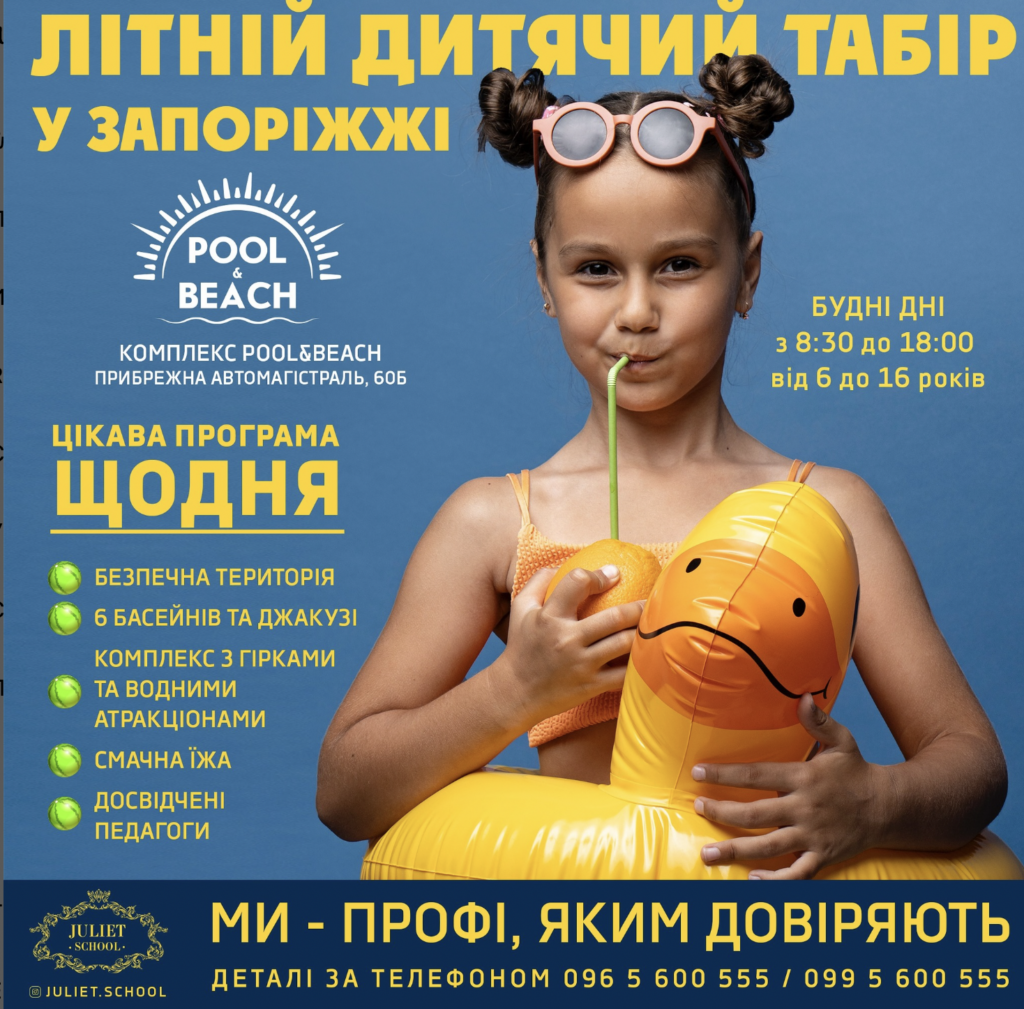 Детский лагерь в Запорожье, расположенный в пляжно-развлекательном комплексе Pool&Beach, открыт для детей от 6 до 16 лет. Лагерь работает с понедельника по пятницу, с 8:30 до 18:00, начиная с 3 июня и до конца летнего сезона.