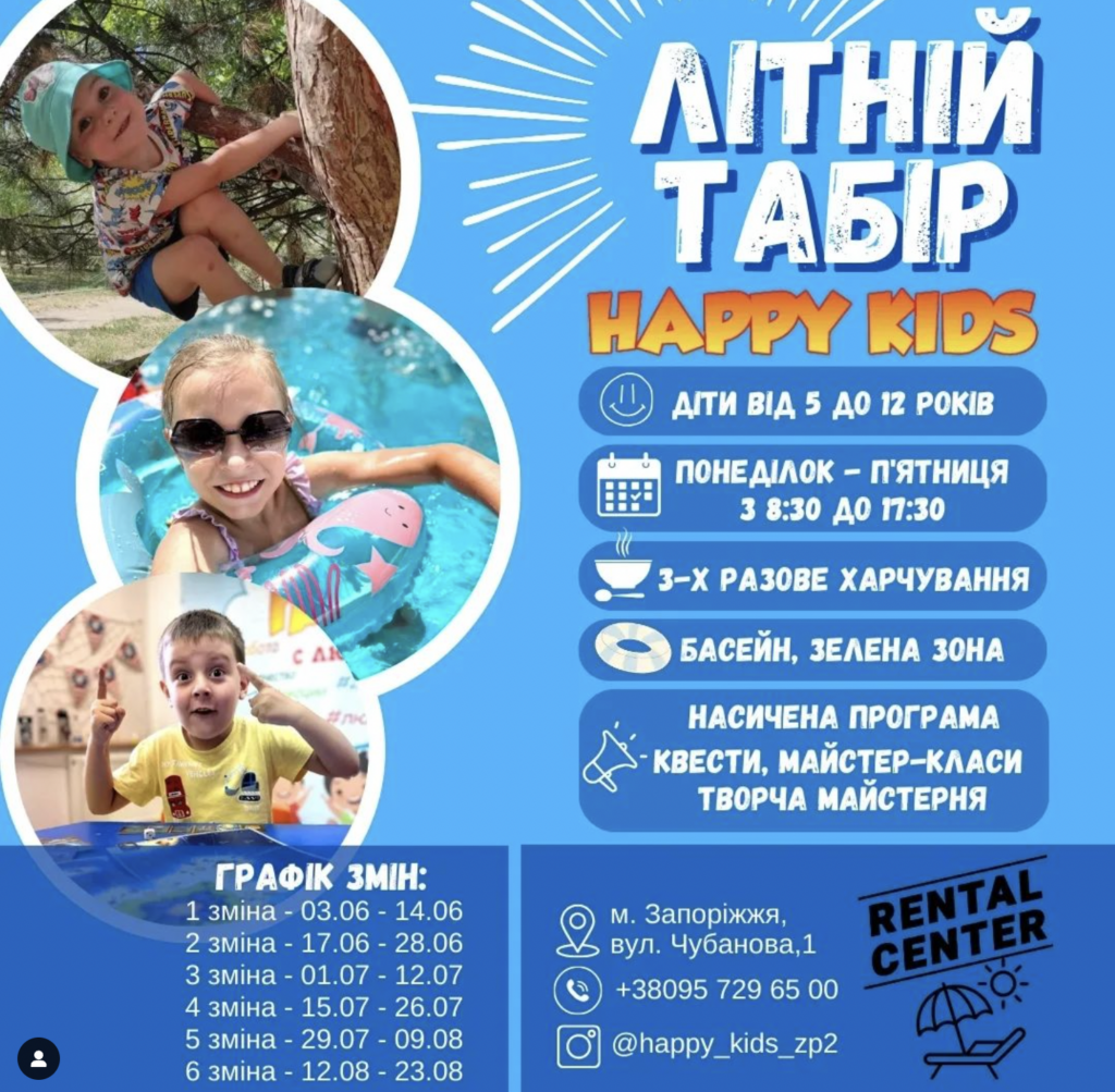 Дневной лагерь «Happy Kids» в Запорожье приглашает детей в возрасте от 5 до 12 лет на летнее пребывание с понедельника по пятницу с 8:30 до 17:30. Лагерь расположен по адресу ул. Чубанова, 1 на территории Rental Center ZP, оборудованной бассейном, где дети могут наслаждаться водными играми и охлаждаться в летнюю жару.