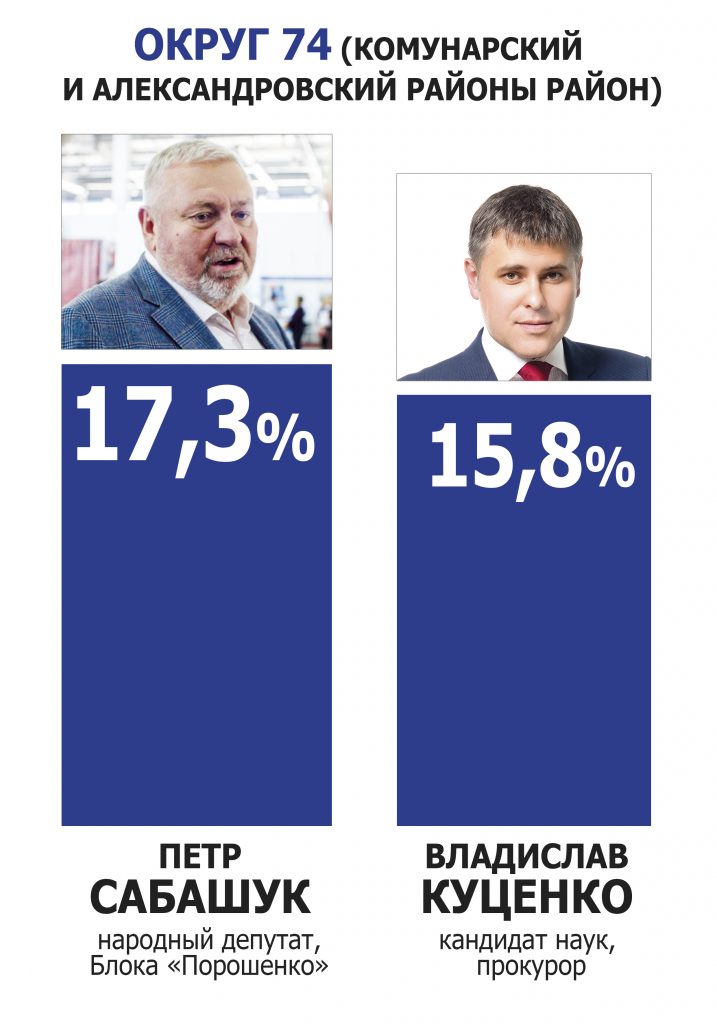74 округ (Коммунарский и Александровский районы). На старте компании в округе наблюдается два лидера, это действующий народный депутат от Блока Петра Порошенко, Петр САБАШУК с рейтингом – 17,3%, и его оппонент, кандидат наук, прокурор открывший ряд дел в отношении соратников Порошенко и выдвинувший ряд инициатив в солнечной энергетике, Владислав КУЦЕНКО с рейтингом поддержки – 15,8%.