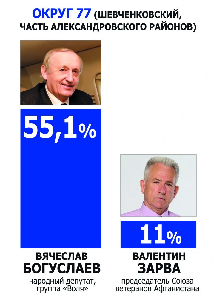 В 77 округе (Шевченковский и часть Александровского района) уже на старте компании определился бесспорный и ярко выраженный лидер, которым является народный депутат, герой Украины, бессменный руководитель предприятия МОТОР-СИЧ, Вячеслав БОГУСЛАЕВ, с рейтингом поддержки — 55,1%. На втором месте, представитель Союза ветеранов Афганистана, Валентин ЗАРВА, который по предварительным данным может быть поддержан Оппозиционной платформой «За ЖИТТЯ» с результатом – 11%.