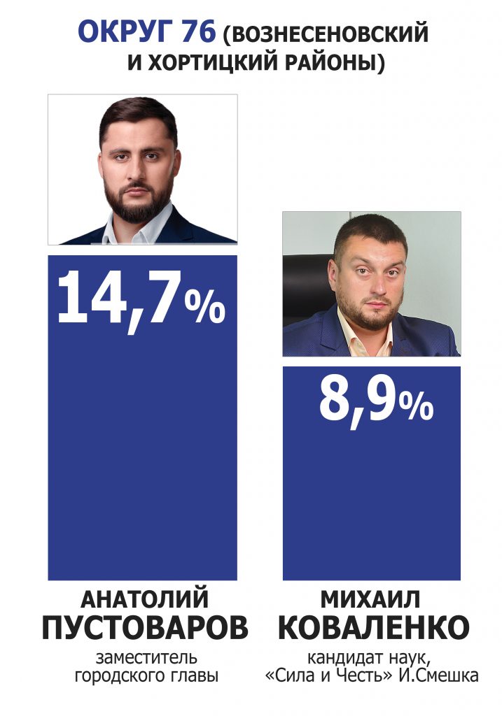 76 округ (Вознесеновский и Хортицкой районы). Лидером является заместитель городского головы Запорожья Анатолий ПУСТОВАРОВ с рейтингом поддержки – 14,7%, который позиционирует себя как представитель команды мэра Запорожья В.Буряка и организовывает многочисленные праздники для детей. Второе место удерживает представитель партии «Сила и честь» И.Смешка, кандидат наук, юрист, предприниматель, известный своими экологическими инициативами, Михаил КОВАЛЕНКО, с рейтингом – 8,9%.